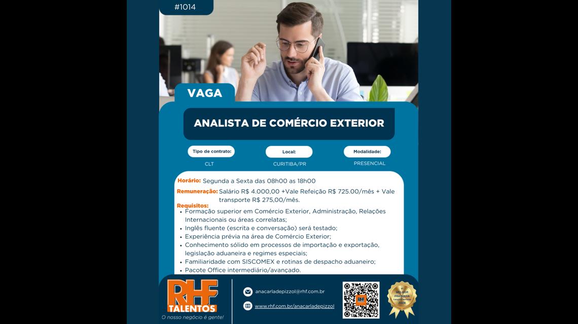 Vaga: Analista de Comércio Exterior Quantidade de Vagas: 01 Método de Trabalho: Presencial