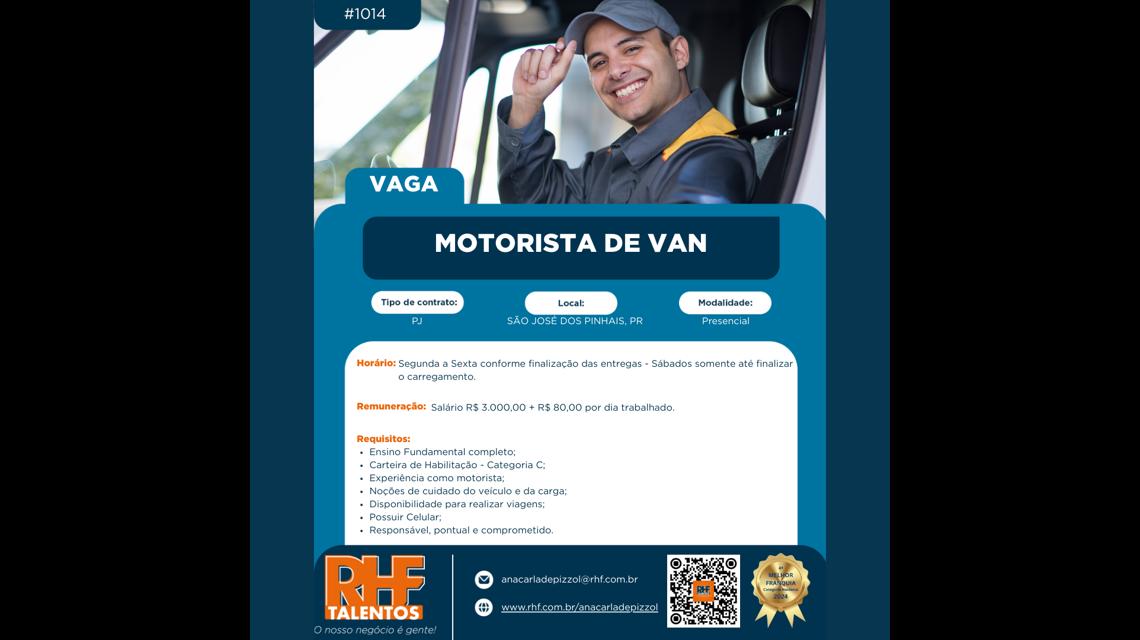 Vaga: MOTORISTA DE VAN Quantidade de Vagas: 01